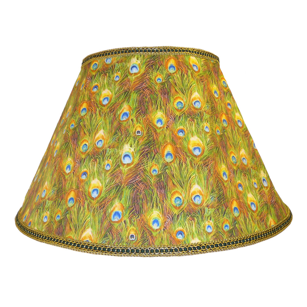 If you have a penchant for peacock plumes, this beautiful design is for you – a drum shade, featuring a repeated eye of peacock feather design in rich greens and blues. Used as a motif in opulent oriental art and in fashion for millennia, this shade will make you proud as a peacock.