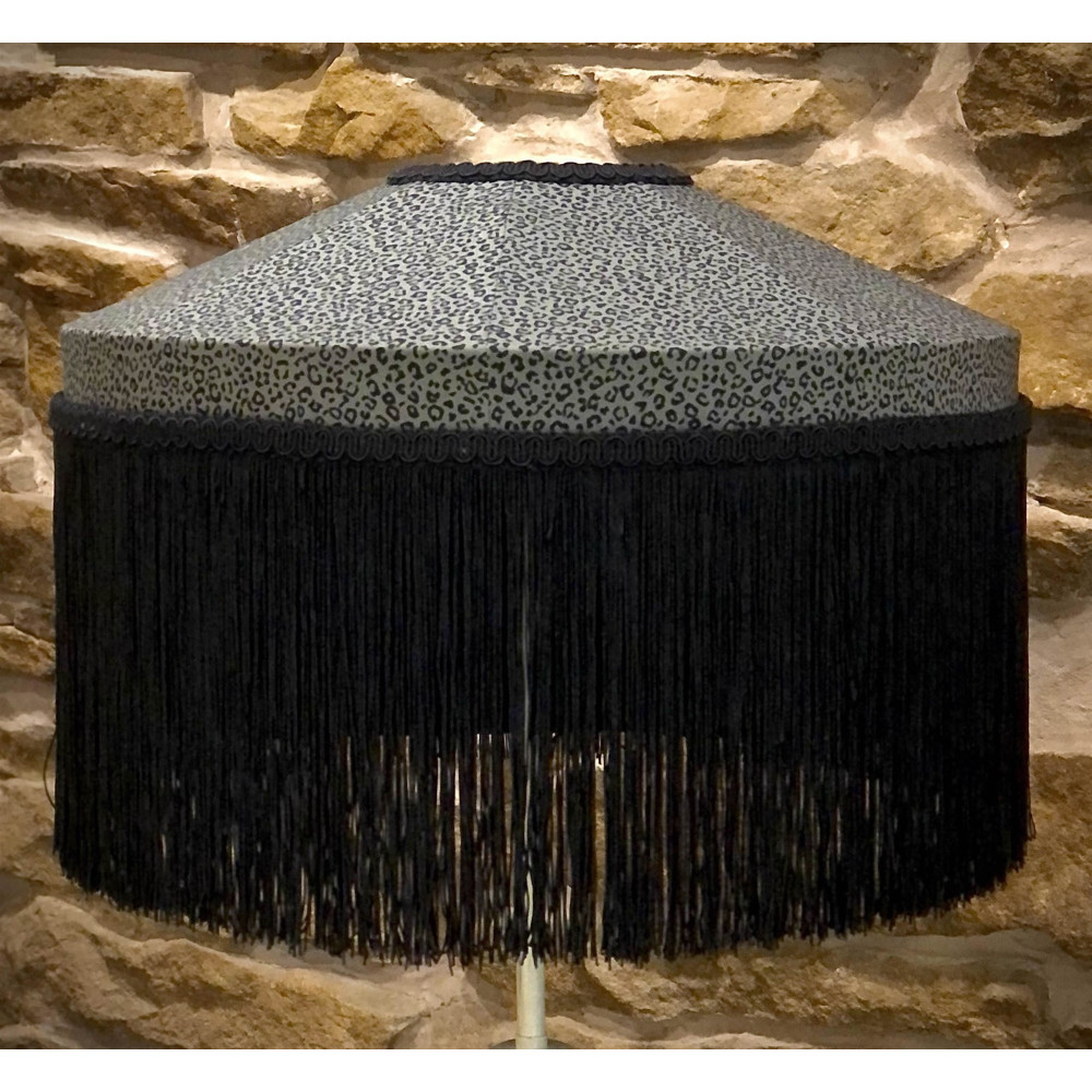 A tiffany style lampshade covered in a khaki green animal print fabric. The shade has a complimentary black braid and is finished off with a 15cm black fringe.