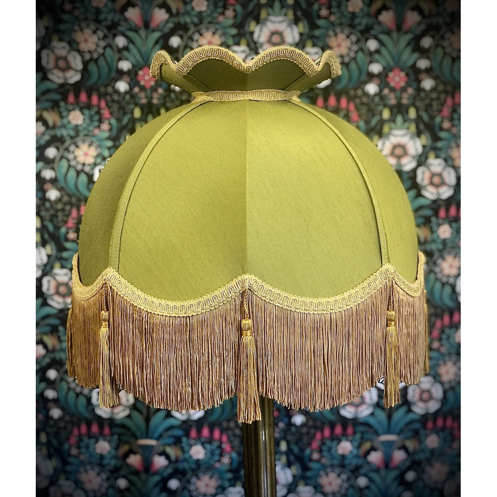 A gallery style lampshade adorned in our holly green fabric. The shade is decorated in antique gold braid, fringe and is finished off with an antique gold tassel on each scallop