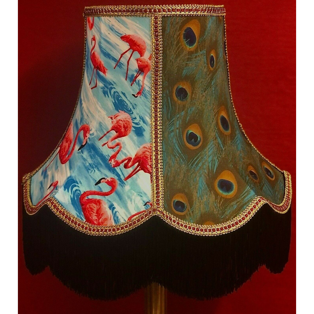 For those inspired by the wonderful wildlife captured on Sir David Attenborough’s latest BBC series, Planet Earth 2, this birds of a feather flamingo lampshade will bring a daring touch to any home. Beautifully dressed in alternating panels of pink flamingo and vibrant peacock feather fabrics, this shade is finished with red-gold braiding and an elegant black fringe.