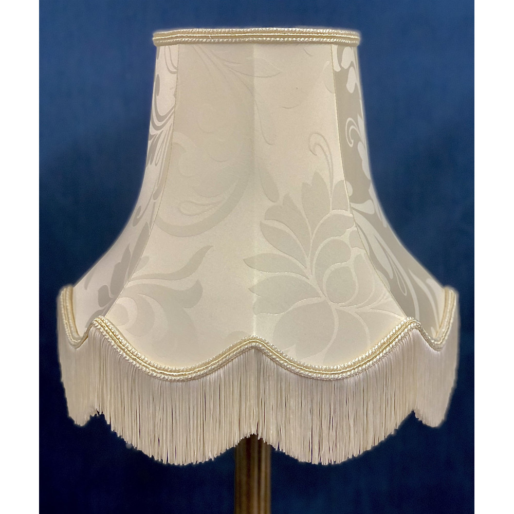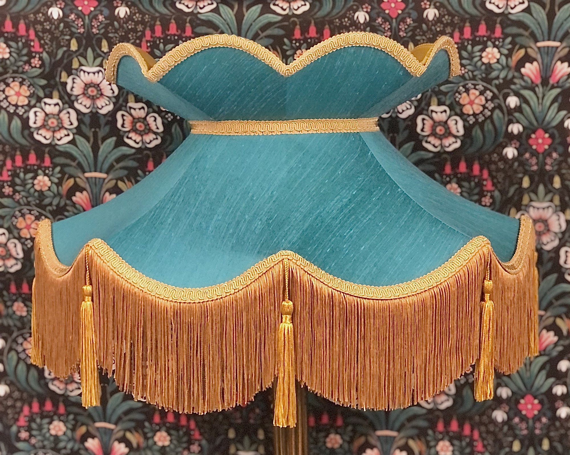 A beautiful Downton Abbey Balmoral crown lampshade, bespoke handmade in our ruby red Paisley fabric which has a 2-tone shimmer effect. These lampshades are complimented with our antique gold braid and fringe. They are finished off with our cream braid and tassels hanging from each scallop, also fully lined on the inside in our inner lining fabric.