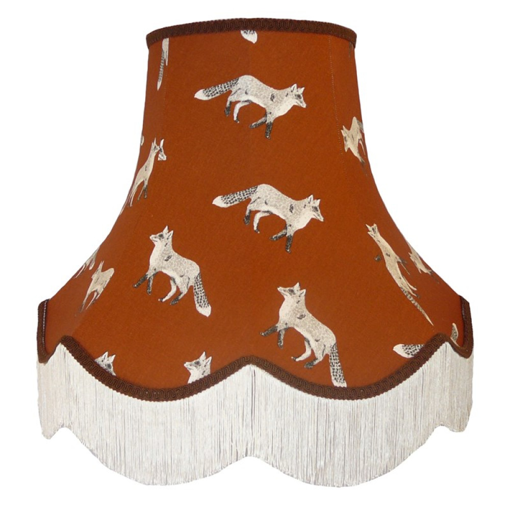 A beautiful lampshade in our designer fox fabric decorated with a matching chocolate braid and ivory cream fringe